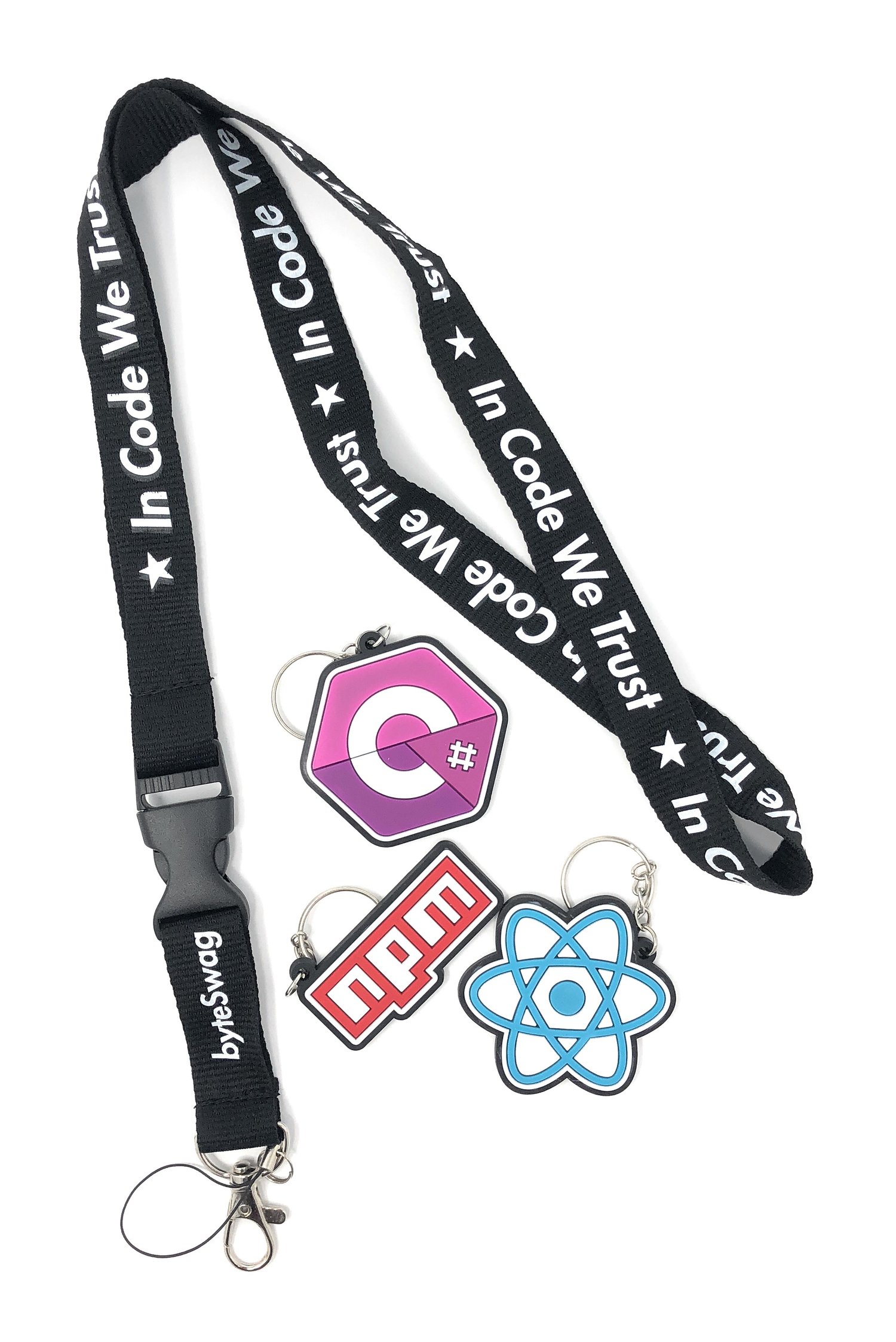 DEVELOPER LANYARD KEYCHAINS PACK - Including In Code We Trust Lanyard and 3 keychains, C Sharp, React and NPM.